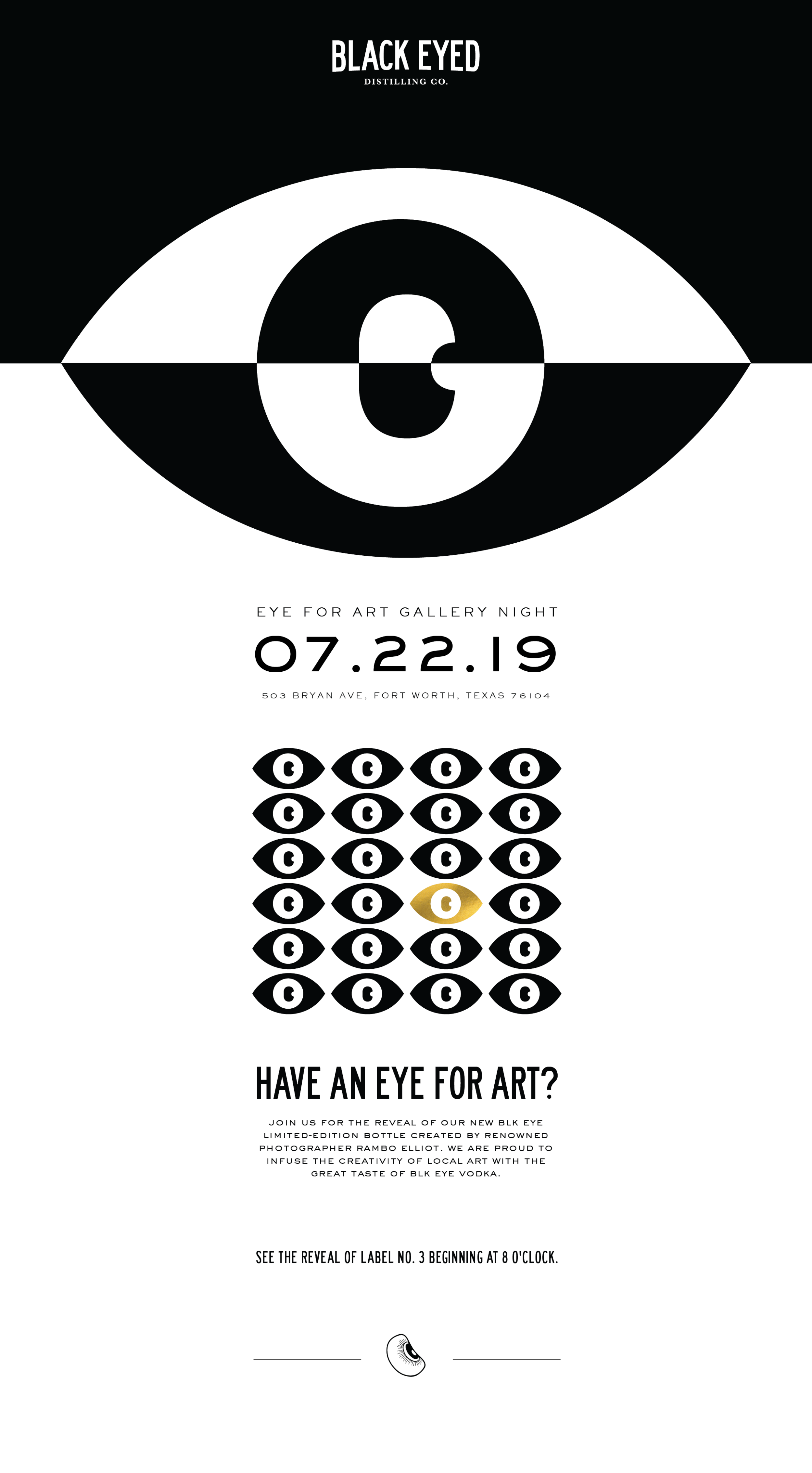 As an employee of GCG Marketing I designed social posts for Black Eyed Distilling Co. - a local Fort Worth distillery. Black Eyed is a large supporter of local artists which led them to promote their new bottle label design with a non-commission gallery night. The following Instagram posts largely served to promote the gallery night as well as tease the third label, designed by renowned Fort Worth photographer, Rambo Elliot.